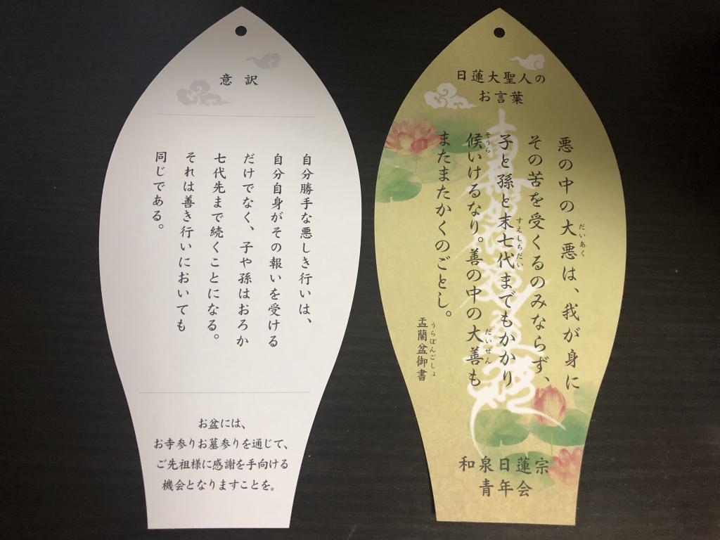日蓮聖人のお言葉をご紹介するスタイルは変えず、デザインを、花びら型(散華型)へと一新し、バックデザインも加え、日蓮聖人のお言葉原文だけではなく、裏に意訳の記載を追加することで、わかりやすく致しました。